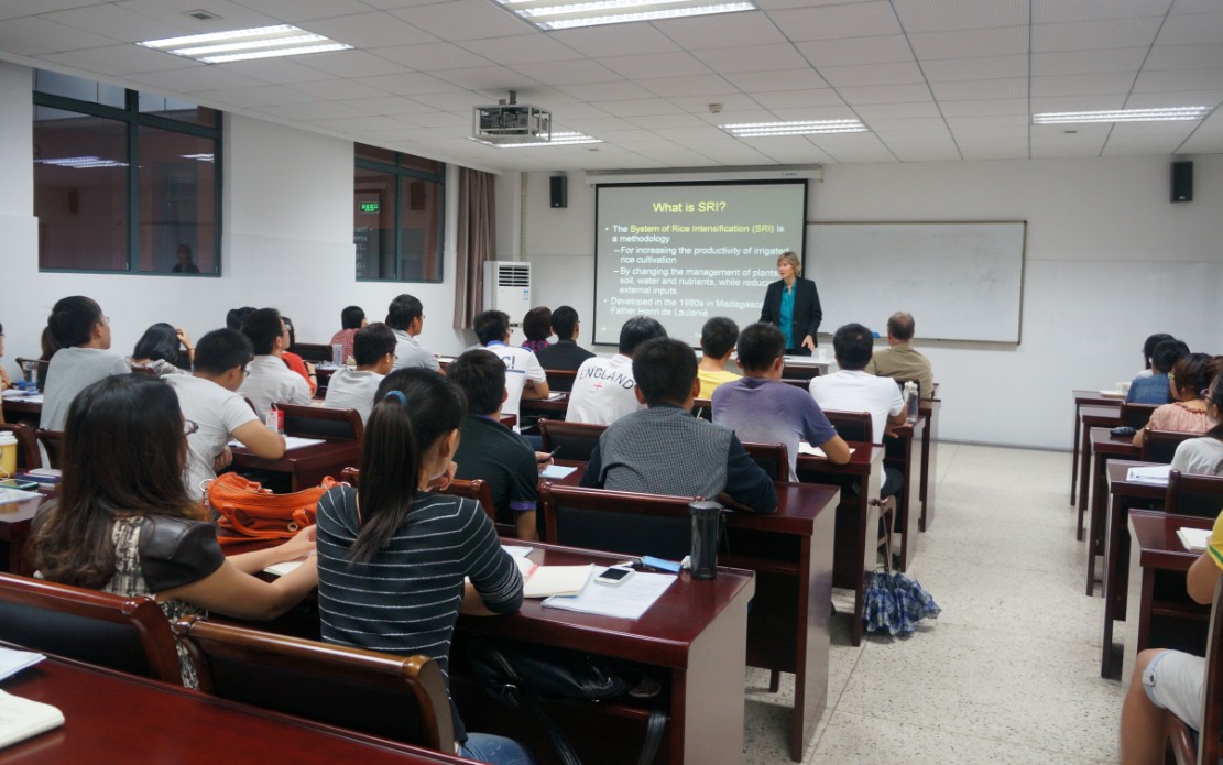 Erika Styger教授首先与大家交流分享了水稻的传统种植技术,强调了传统种植技术愈发不适应现代社会的发展,进而介绍了SRI技术的含义、方法及推广意义,如SRI技术是一种水稻强化栽培技术,它能通过改善水稻种植过程中灌溉、土壤、水和营养的条件,大幅提高水稻产量。Erika Styger教授总结SRI技术是现代水稻种植技术的发展趋势,提醒同学们要清楚地认识粮食问题的严峻性,鼓励同学在粮食研究方面有所创新,将所学知识运用于实际。Erika Styger教授在整场讲座中叙述简明易懂、生动有趣,赢得了大家的阵阵掌声。在报告尾声,国产做爱视频