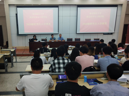 在食品科学与工程楼阶梯教师举行2020级研究生新生入学教育暨师生双选会。学院分管研究生副院长唐培安教授、导师代表沈新春教授、研究生辅导员施怡和优秀研究生代表张军淼参加会议,会议由分管院长唐培安教授主持。