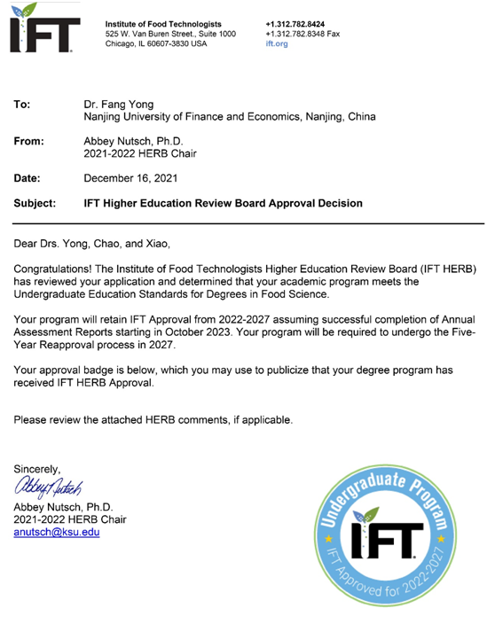 近日,经IFT(Institute of Food Technologists,美国食品科学技术学会)高等教育评审委员会审议和决议,我校食品科学与工程本科专业顺利通过IFT国际认证,有效期五年满额认证(2022-2027年)。
