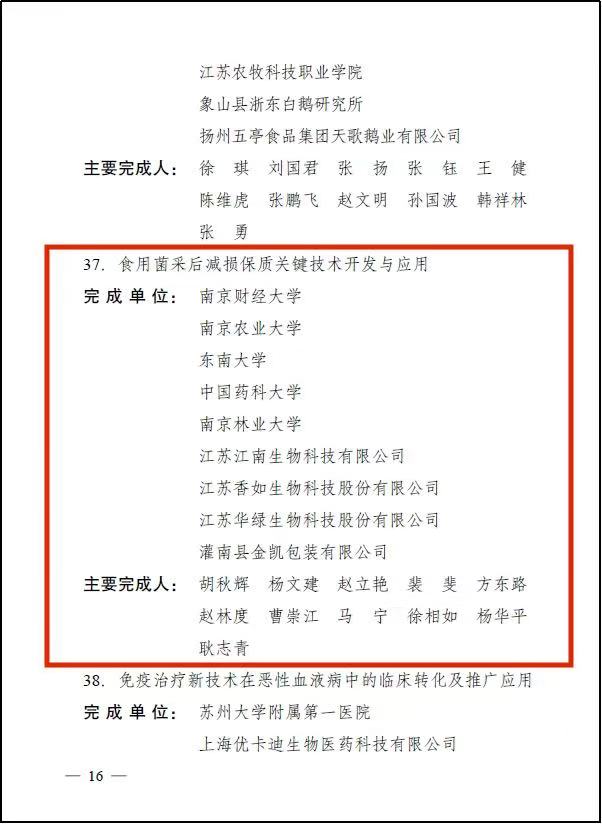 胡秋辉教授团队领衔申报的项目“食用菌采后减损保质关键技术开发与应用”荣获2022年度江苏省科学技术奖一等奖(我校团队成员:胡秋辉、杨文建、裴斐、马宁),这是胡秋辉教授团队继“食用菌精深加工关键技术创新与应用”成果获2019年度江苏省科学技术奖一等奖后再次获此殊荣。