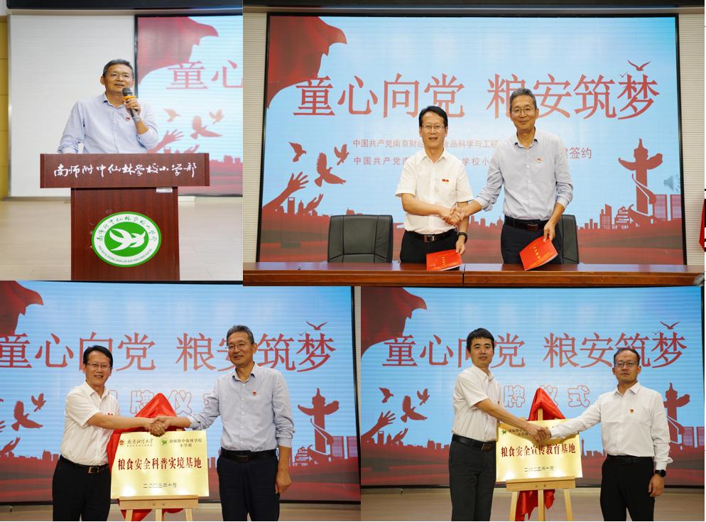 学院党委书记许文彪介绍了粮食安全国家战略问题、学院的基本情况、办学特色,希望能够以本次党建活动为契机,与南师附中仙林小学进行多方面深入合作,结出丰硕成果。许文彪书记与南师附中仙林学校小学部党委书记肖全胜签订党建共建协议书,副院长(主持工作)唐培安为“粮食安全宣传教育基地”揭牌。随后,两校各支部代表也签订协议并举行“粮食安全科普实境基地”揭牌仪式。