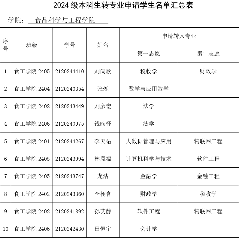 根据《国产做爱视频 本科生转专业管理办法》(南财大校字〔2024〕15号)、《关于2024-2025学年第二学期本科生转专业工作安排的通知》(南财教字〔2025〕18号)要求,经学生个人申请、学院转专业领导小组审核,现将2024级本科生申请转专业学生名单予以公示。