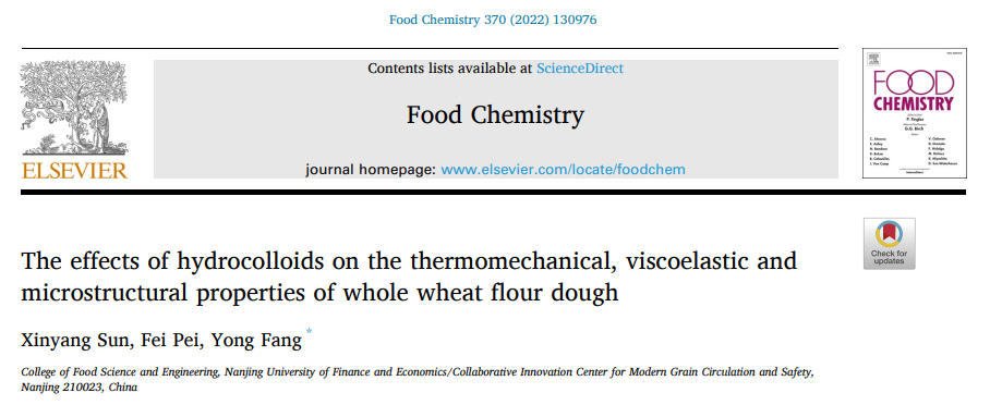 为第一单位,孙昕炀博士为第一作者,方勇教授为通讯作者。该项研究工作得到了国家重点研发计划项目、江苏省自然科学基金与国家自然科学基金的资助。本研究通过综合探索亲水胶体对全麦面团热力学特性、粘弹性和微观结构特性的影响作用,为优化全麦面团加工工艺,改善全麦产品品质提供了科学方案。