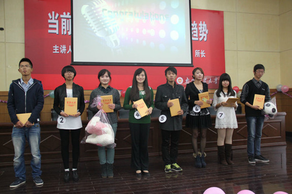 经过激烈的角逐,王丹同学以其过硬的心理素质和丰富的主持经验,一路过关斩将,最终夺得大赛一等奖,张旭同学获得大赛二等奖,唐帅、边亢愚同学获得大赛三等奖。另外,王欣荣同学获得最佳台风奖,唐铭泽同学获得最佳才艺奖,胡晴晴同学获得最佳人气奖,王玉同学获得最佳口才奖。