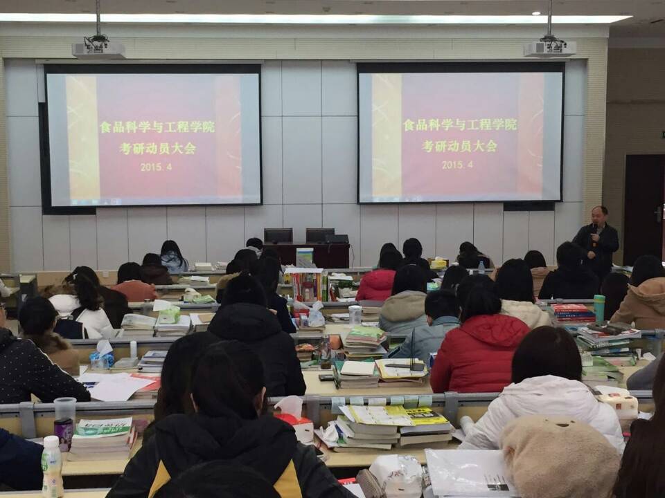 考研动员大会在我校仙林校区食品科学与工程楼考研自习教室顺利开展,院长胡秋辉,团总支书记周进进及一百多名2016考研同学们参与了此次动员大会。