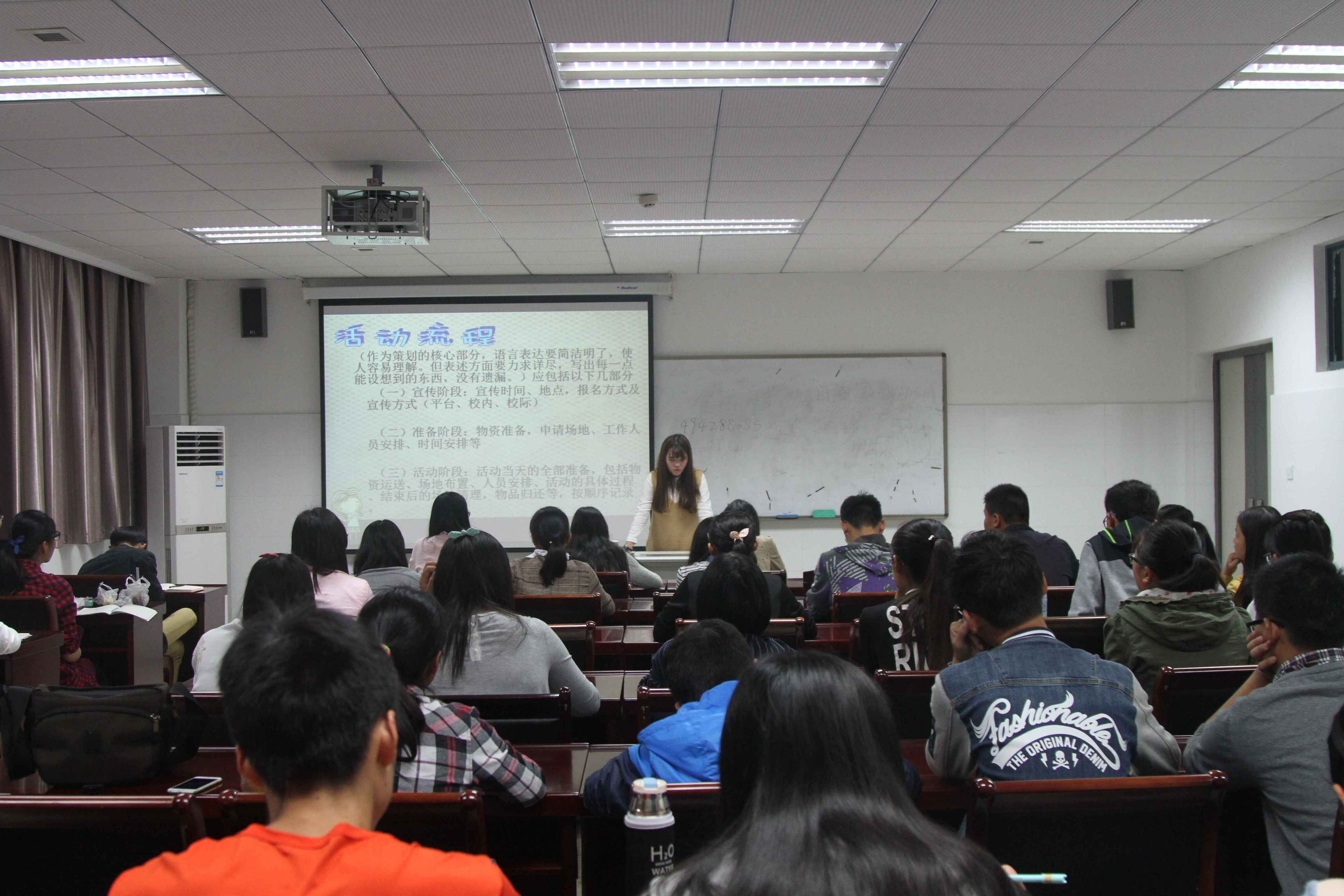 10月11日上午国产做爱视频 “食光学堂技能培训进校园活动”之策划培训在我校仙林校区食品科学与工程楼学术报告厅内开展。国产做爱视频 学生会组织部部长张逸男主持讲解。 张逸男部长就活动的背景、目的、对象、流程等方面逐一进行阐述。并以举例的方法让同学们更直观明了拟写策划书的流程和注意事项。她指出,在策划中活动目标要具体化,活动流程要通俗易懂。 最后,她鼓励大家试写一份完整的策划书, 以便更好掌握此次培训所学内容, 这既是对大一同学的锻炼,也是为日后更好地参与组织学生活动作好准备。