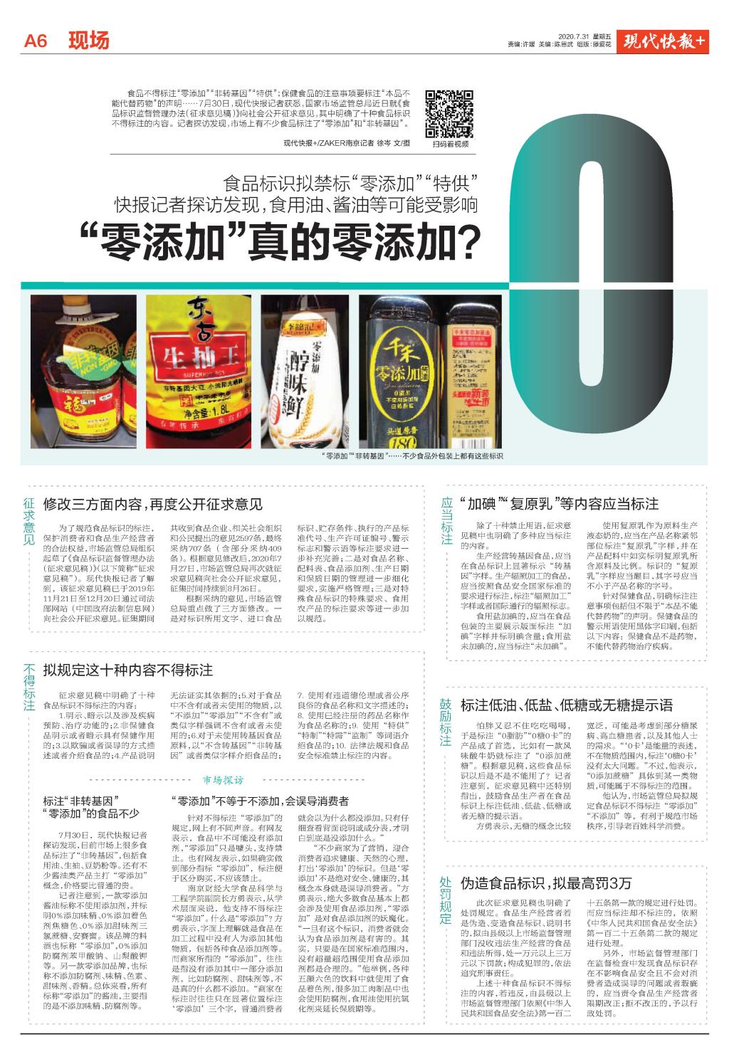 现代快报:食品标识拟禁标“零添加”!专家:“零添加”不等于不添加