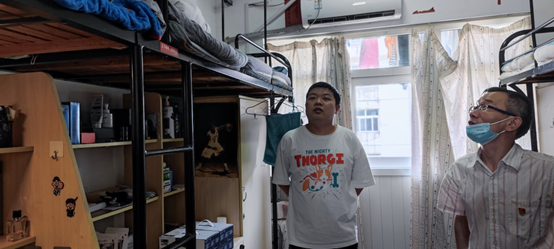 随后,丁书俊处长深入仙林校区11号宿管站18栋403A寝室,调研走访结对联系的研究生并带去了慰问品,杨浥老师陪同调研。在学生宿舍,丁书俊处长亲切询问了同学们目前的学习情况及宿舍生活的实际困难,就同学们专业学习、科学研究、体育锻炼以及寝室安排等方面开展了面对面交流,并认真听取了同学们的诉求和建议,表示会及时反馈、尽力解决同学们提出的问题。