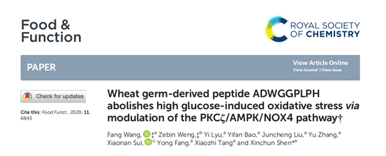 沈新春教授课题组采用独特的二步双酶酶解筛选技术,从麦胚清蛋白中筛选出了高活性的抗氧化肽,用ESI-TOF MS/MS鉴定其结构。并以高糖诱导的血管平滑肌细胞(VSMCs)和STZ诱导的糖尿病小鼠为模型,研究该抗氧化肽的抗氧化作用及机制。相关研究结果以“Wheat germ-derived peptide ADWGGPLPH abolishes high glucose-induced oxidative stress via modulation of the PKCζ/AMPK/NOX4 pathway”为题发表在Food & Function杂志上。国产做爱视频
