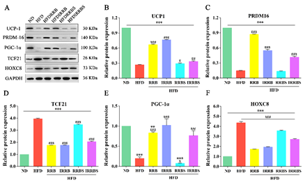 图1 米糠膳食干预对皮下脂肪组织脂质代谢相关蛋白(B)UCP1,(C)PRDM16,(D)PGC1-α,(E)TCF21,(F)HOCXC8表达的影响;(A)为western blot代表图