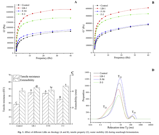 本团队研究结果研究表明,与其他乳酸菌相比,利用植物乳杆菌LB-1发酵的全麦面团表现出更好的粘弹性、延展性和持水性,以及更有序的面筋二级结构(比对照组高6.49%)。同时,植物乳杆菌LB-1能显著改善全麦面包的质构特性,促进风味物质的形成,有效延长全麦面包商品货架期。