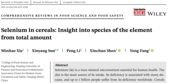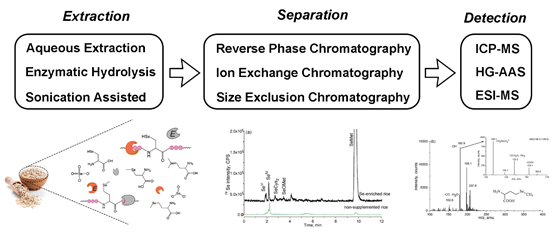 题为 “Selenium in cereals: Insight into species of the element from total amount” 的论文。该文系统地阐述了谷物中硒的含量和生物强化途径,论述了谷物中不同化学形态硒的分析流程和技术方法,揭示了硒的形态与其生物活性的关系,讨论了谷物来源的硒相关研究未来面临的主要问题和发展趋势。农作物因受到遗传品种、土壤条件、栽培方式以及加工方式的影响,导致谷物中硒含量变化范围较大,通过外源施用硒肥的方式可以大幅提高谷物籽粒中的硒含量。目前,最主要的谷物硒形态分析流程包括提取、分离和检测三个主要步骤,最常用的分析技术方法是通过温和适宜的酶促提取法获得各形态的硒,再用高效液相色谱(HPLC)联用电感耦合等离子体质谱(ICP-MS)分析定量硒的具体形态。谷物中含有无机硒(硒酸盐、亚硒酸盐)和有机硒,包括硒代甲硫氨酸(SeMet)和小分子硒肽等。有机硒比无机硒具有更好的生物利用度、更高的营养价值和更低的毒性,活性硒肽具有抗氧化、免疫调节、缓解重金属毒性等多种生理功能。谷物的硒形态以SeMet为主,还有多种活性硒肽,表明谷物是膳食硒的优良载体。文章强调在评价硒的营养健康作用,不仅仅考虑硒的摄入总量,而且也应考察硒的具体存在形态。因此,复杂样品中硒形态的高通量和快速高效的分析手段是未来的重要研究挑战,硒形态和生理功能的构效关系及其作用机理仍然是重要研究方向。