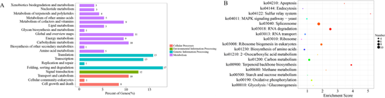 本研究采用转录组学技术,分析了纳米复合包装与普通聚乙烯(PE)包装下金针菇基因表达的差异。与普通聚乙烯包装相比,在纳米复合包装的金针菇中鉴定出379个差异表达基因,包括161个上调基因和218个下调基因。纳米复合包装通过上调msp2基因的表达,保证了ROS的稳态,进而抑制了cyc1的表达,延缓了PCD进程,提高了金针菇的抗逆性。同时,纳米复合包装还通过调节氧化磷酸化和糖酵解/糖异生代谢途径相关基因cox1101和MSTRG.9055.9的表达,确保了充足的能量供应。此外,纳米复合包装通过调节GLG4和SPAC16E8.04c基因的表达,抑制了木质素的积累,延缓了金针菇的木质化进程。因此,纳米复合包装可能通过调控ROS、PCD、能量以及木质素代谢途径中相关基因的表达,延缓采后金针菇的品质劣变。该研究从基因水平进一步验证和完善了团队前期的研究,有助于促进纳米复合包装在食用菌保鲜方面的应用。