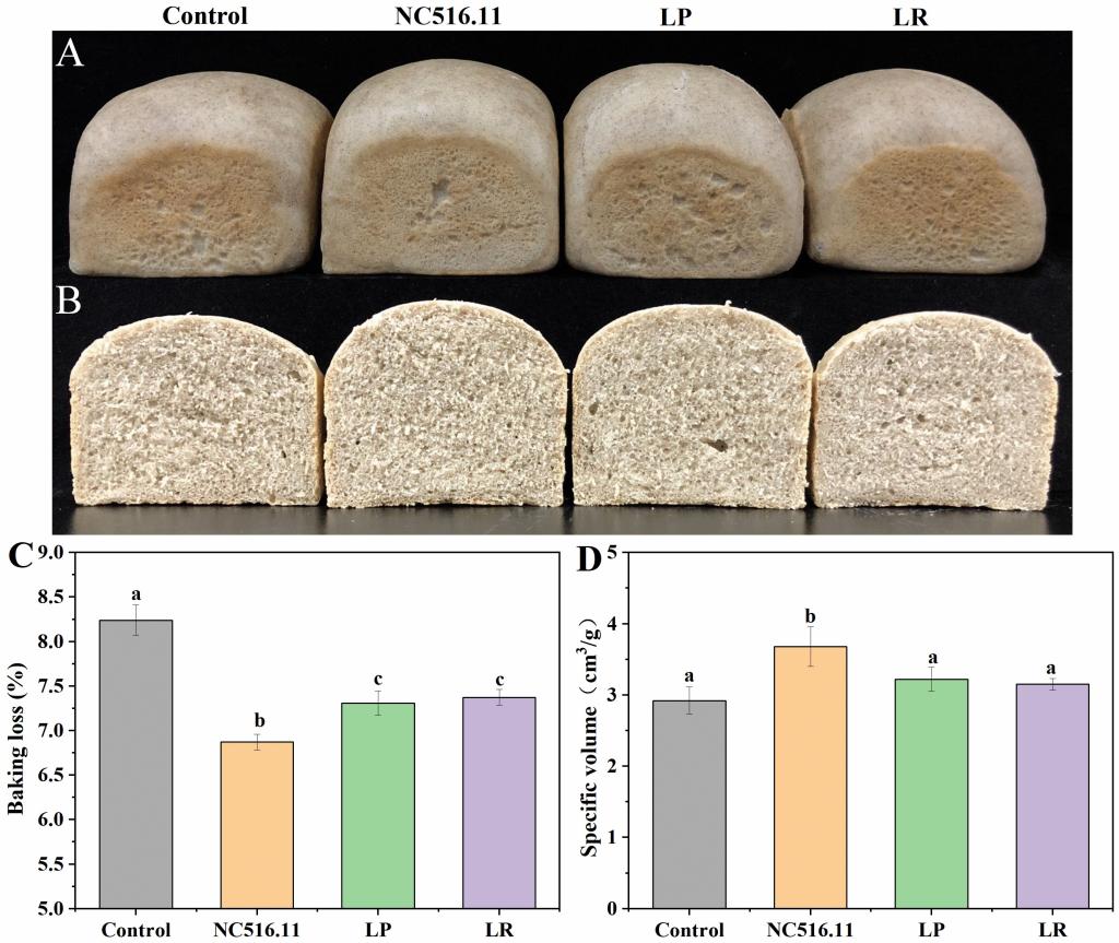 图4 不同乳酸菌发酵面包的的外观、横截面比容和烘焙损失