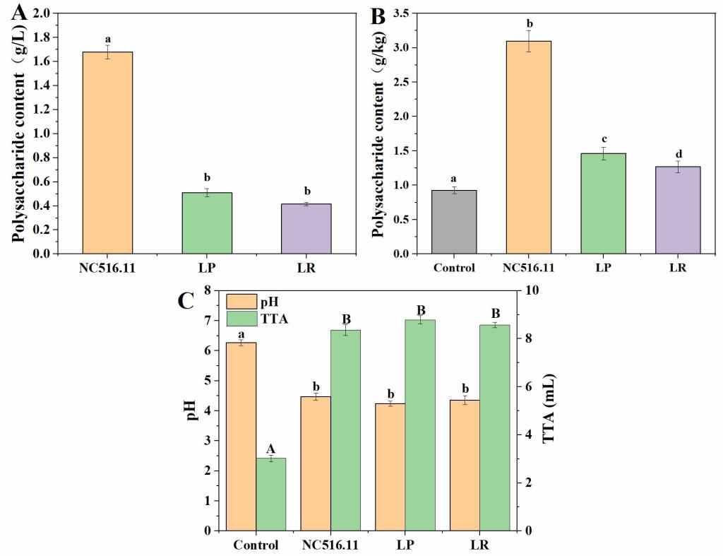 图1 不同乳酸菌发酵产生的胞外多糖含量、pH和TTA含量