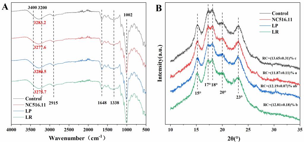高产EPS乳酸菌W. cibaria NC516.11发酵荞麦面团,其代谢产生的EPS取代麸质介入到荞麦面团发酵中,可以增强分子间氢键,改善分子交联,减少淀粉的再结晶,促进面团中水分与其他组分结合形成有效网络结构,从而提高面团流变学特性,实现荞麦面团及其制品感官品质的有效改善。